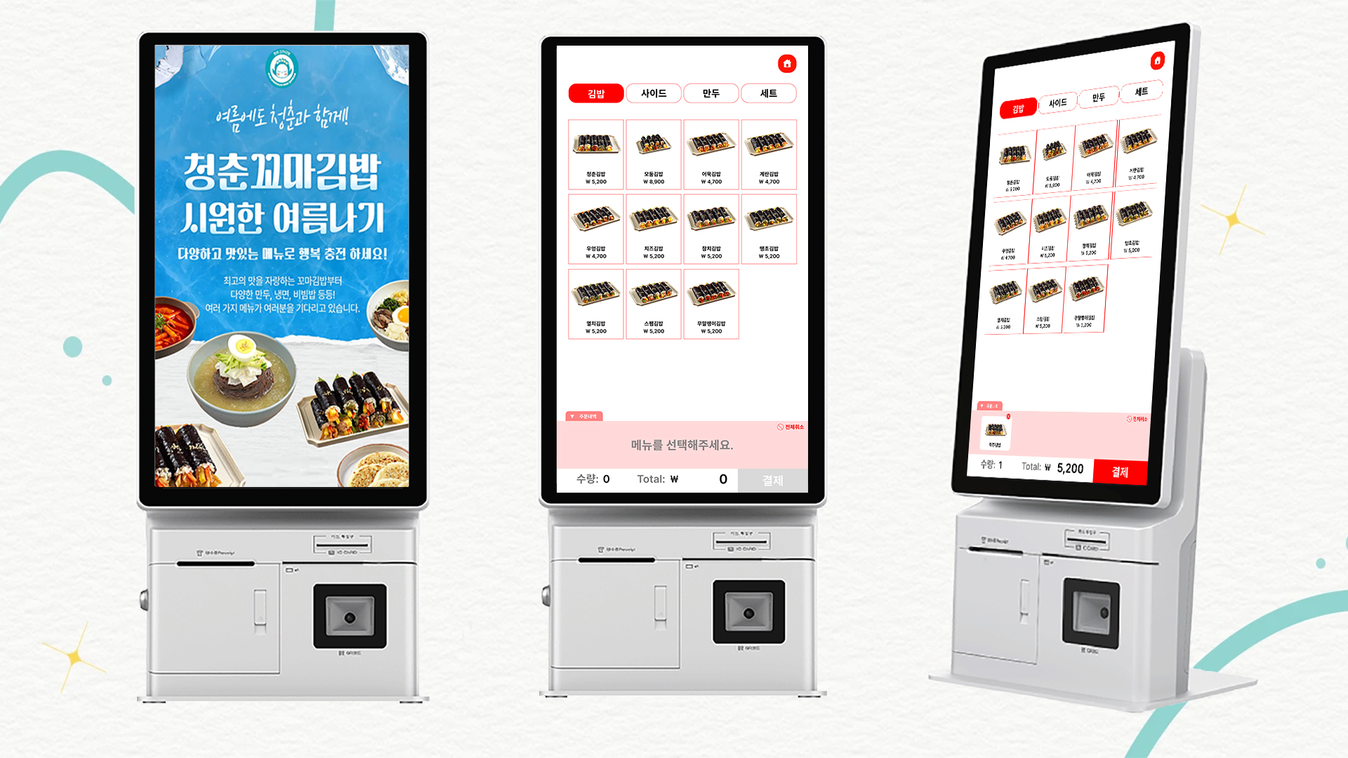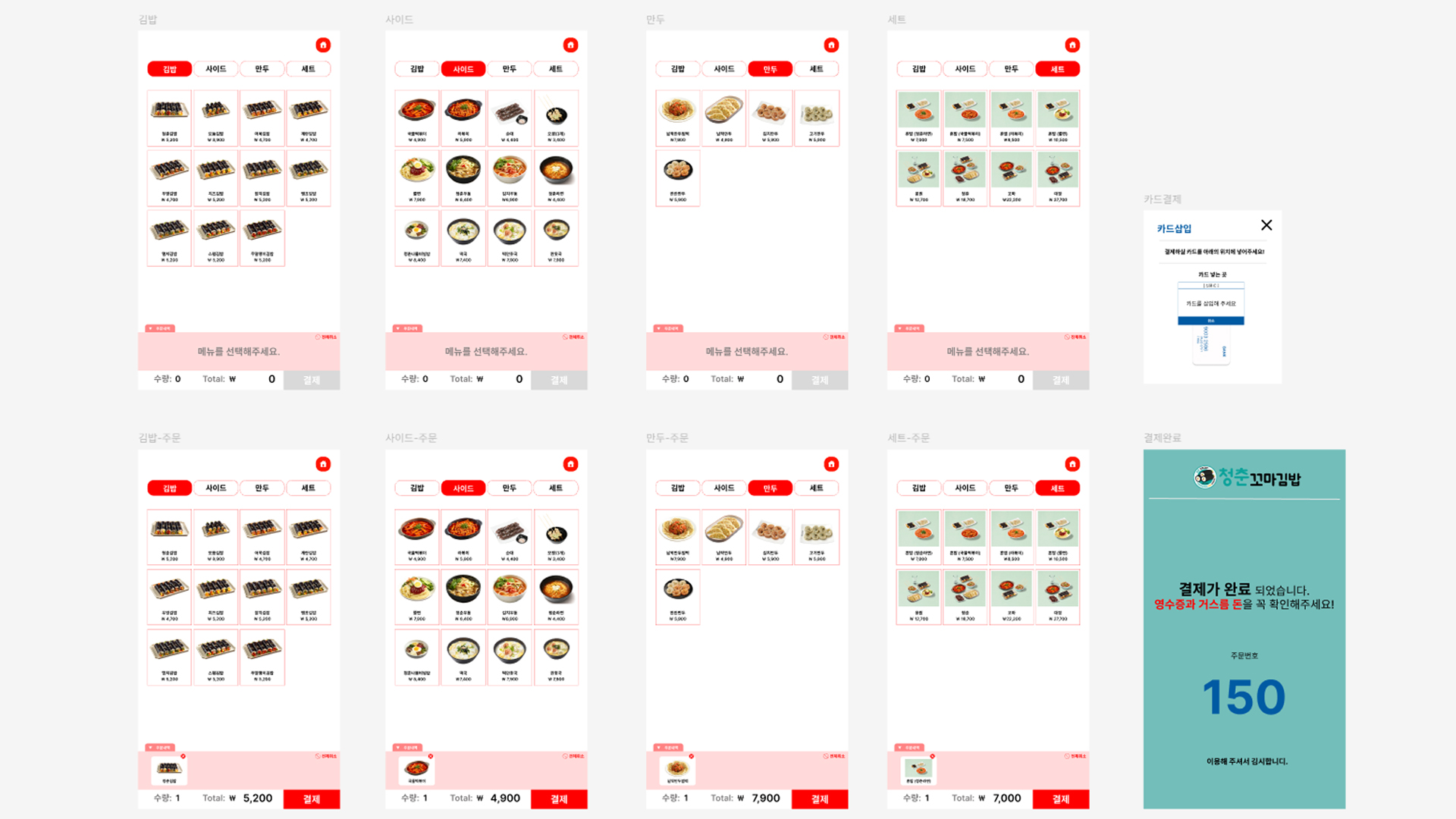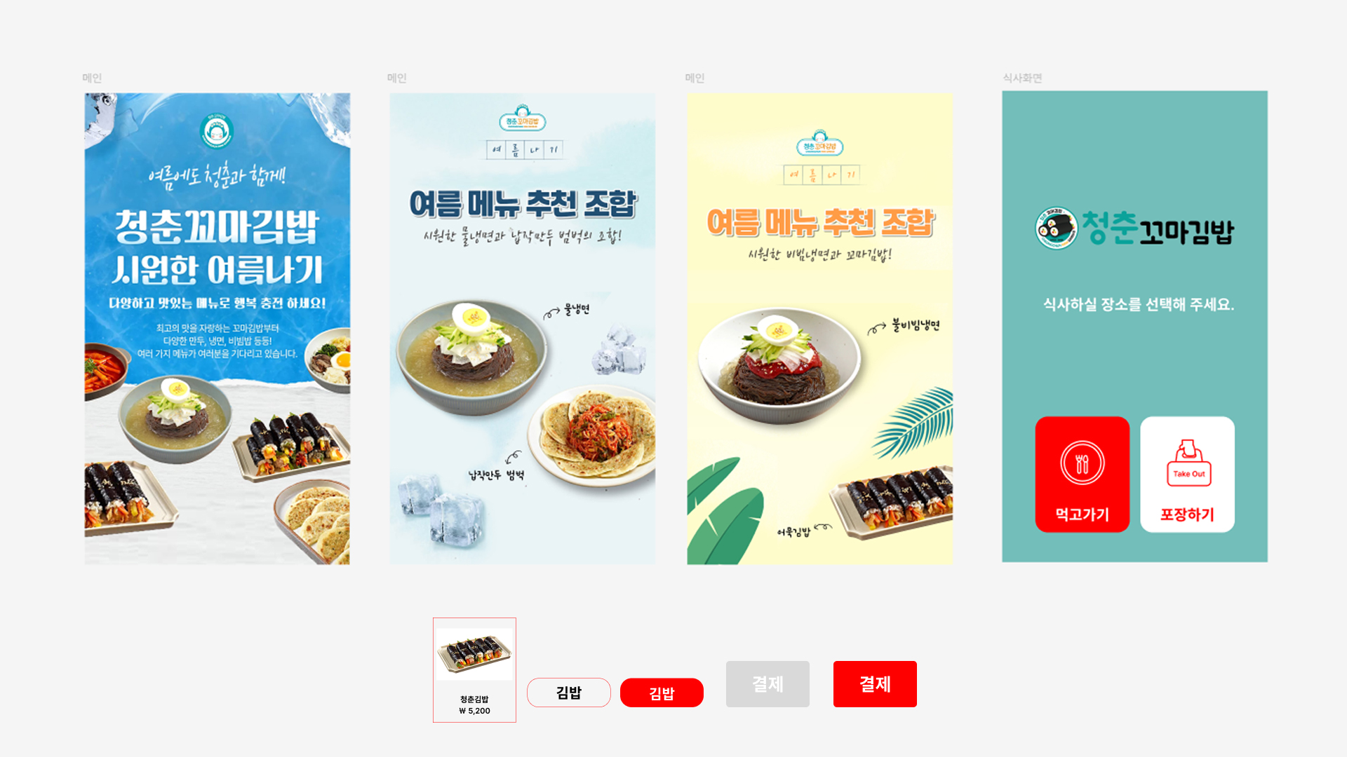 청춘꼬마김밥에서 실제로 사용하는 주요 색상들을 뽑아 만들었으며, 키오스크 처음 화면은 포토샵에서 청춘꼬마김밥 포스터를 가져와 크기 등을 수정하여 완성하였다.